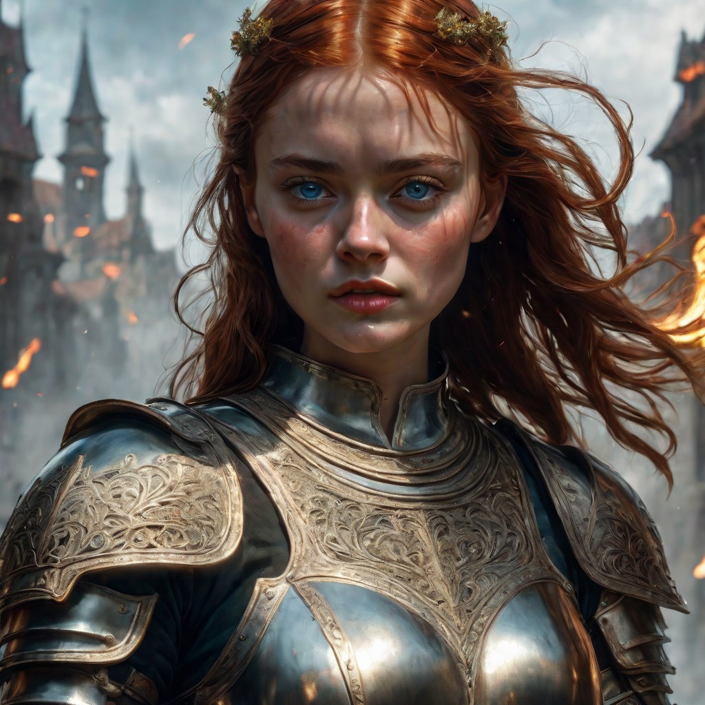 High resolution ultra-realistic of Beautiful burly Joan of Arc, 8k, capturing the intensity of the moment, cinematic lighting, standing on a bloody and stormy Battleground in a fighting pose, wavy red hair, realistic bloody dirty pale face, realistic blue eyes, fire, intricately designed iron and silver medieval armor, brown mini skirt, LOTR Aesthetic, perfect athletic figure, beautiful Sadie Sink as Joan of Arc, fire, ultra realistic, cinematic style, athletic figure, dark fantasy, dramatic lighting, wet and sweaty skin, dirty skin, athletic figure, dark medieval, dramatic lighting, Greg Rutkowski style,, Warrior girl on in iron armor, hyper-detailed, hyper-realistic, bright colours, Attractive 25 old years girl, Attractive, beautiful firm Breasts, sharp focus, digital painting, Photograph Taken on Nikon D750, Alphonse Mucha, 8K, athletic figure, Hyperdetailed, hyperrealism, Attractive, Attractive bust girl, asymmetric balance