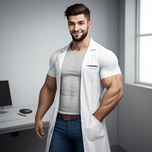 a beautiful 18yo male lean doctor is wearing a white unbuttoned lab coat and is shirtless and he has short brown hair, full body shot, cover model, and he is inside a hospital, he is smiling as he looks down at a very short hugely muscular 18yo bodybuilder man patient who is seated and is wearing a very tight white T-shirt with a plunging neckline showing most of his huge pecs and deep cleavage and blue jeans and he is beardless and clean shaven and has a huge bulge in his crotch and he has medium length black hair, messed up style hair, cover model, dark tan and glossy sweaty skin, skin details, with one arm raised out to the side as he flexes his huge bicep and he is staring up at the doctor and he has matching earrings and bright blue eyes, ultrarealistic, hyperdetailed photography, soft light, model look