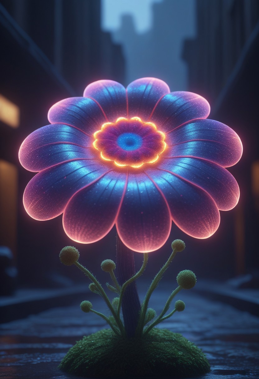 masterpiece, best quality, good quality, very awa, newest, highres, absurdres, ,score_9, score_8_up, score_7_up, Patchwork ,art style, photorealistic, cinematic lighting, concept art, octane render, unreal engine 5, Very detailed, vibrant colors, 3d, smiley flower toon made of Patchwork looming over the end of the world, neon, dystopian, photorealistic, cinematic lighting, concept art, octane render, unreal engine 5, Very detailed, vibrant colors, 3d, ptchkrawk
