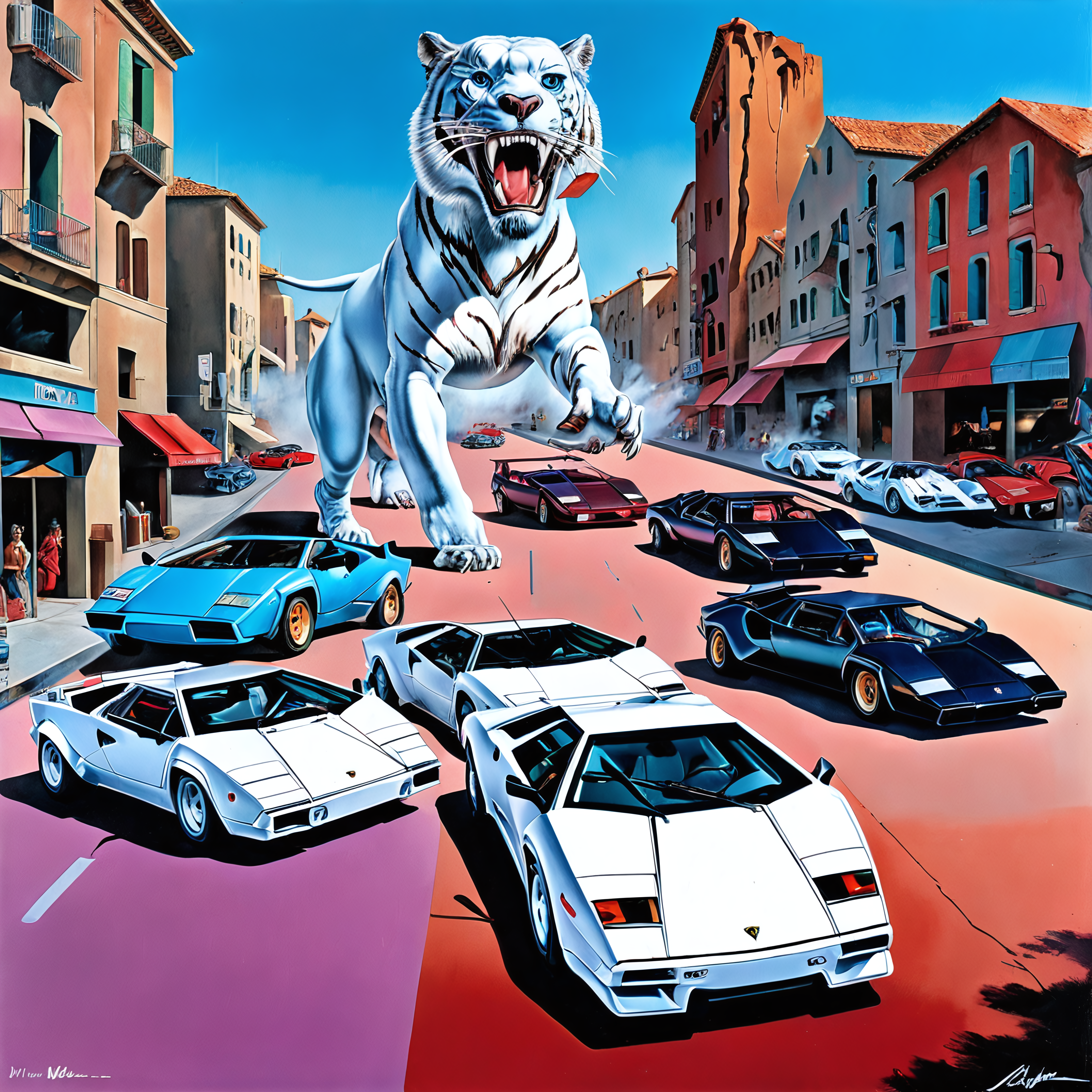 8k quality painting, d4lixl, d4lixl dalillusion, d4lixl dalitiger, d4lixl dalifigures, d4lixl dalimelt - multiple countach vehicles of various colors are scattered floating in the air, throughout a surreal city landscape, some cars are melting, parts of the countach form abstract objects floating throughout the scene, white tigers emerge from some of the countach vehicles but one large white tiger roars in the center of the frame,