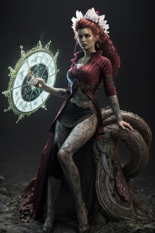 A young woman with a mystical and dark appearance sits elegantly while holding a large blue snake with glowing eyes and detailed scales. Her gaze is intense, with bright emerald green eyes, and she displays a slight enigmatic smile. Her dark red hair transitions to a bright ruby red tone at the ends, giving a shiny effect. She wears a black dress with gold details and an oriental print, paired with a feathered headdress and intricate jewelry. His arms and shoulders are covered in tattoos of snakes and mysterious symbols. The scene's lighting is dramatic, with a red and purple glow on the ground around it, suggesting a magic circle or invocation. The background is dark and blurred, emphasizing the character's mysterious and powerful aura.