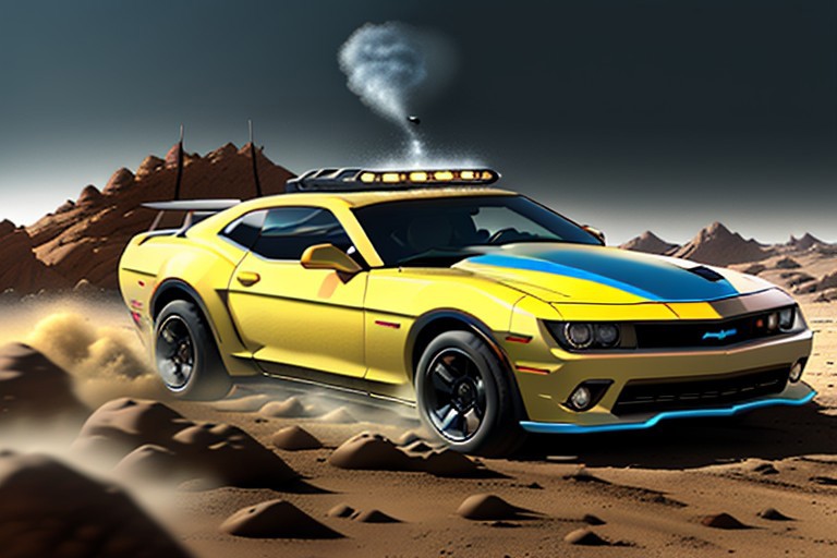 Futuristic Chevrolet Camero, With Lense flairs and dust from driving on rough terrain