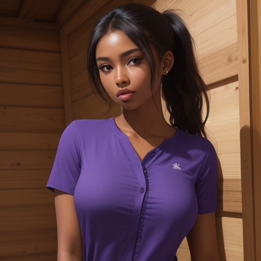 (best quality, masterpiece), 1 girl, beautiful 22 year old Latina woman, (dark skin), (black hair) ponytail, braid, fit body, intricate detail, sophisticated detail, depth of field, good face, photorealistic, medium breasts, (shorts), (purple shirt), (purple shirt), cabin, (purple shirt), (purple shirt), good ass, good butt, curvey,