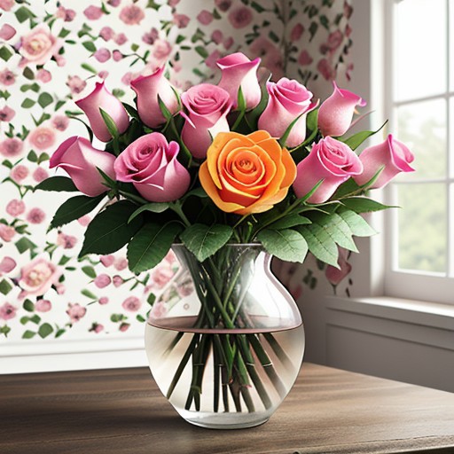 flower roses blooming bouquet wallpaper, water drops on flowers, present, gift, best wishes, realistic yet ethereal, orange and pink colors, spring room day time sunny day, photorealistic