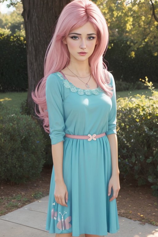 score_9, score_8_up, score_7_up, score_6_up, pink hair, big blue eyes, 18 years old, cutest girl in the world, round butt, dynamic lighting, large perky breasts, photo, photorealistic, ultra realistic, film grain, large perky breast, super long legs, horny, looking at viewer, light blue sundress with butterfly print, photorealism, butterflies in background, powerful, submissive, (intense red blush:1.4, seductive, seduction, slave), pleasure, orgasm, sad eyes, ((long shot, full body shot)), standing, fcNeg, mlpfluttershy, hair ornament, dress standing in park,