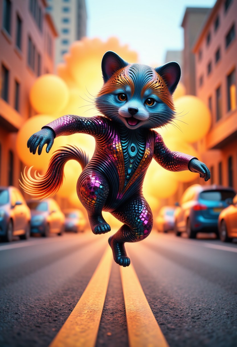 rocket racoon made out of fractangles, in the middle of the street, jumping and bouncing, explosions in the background