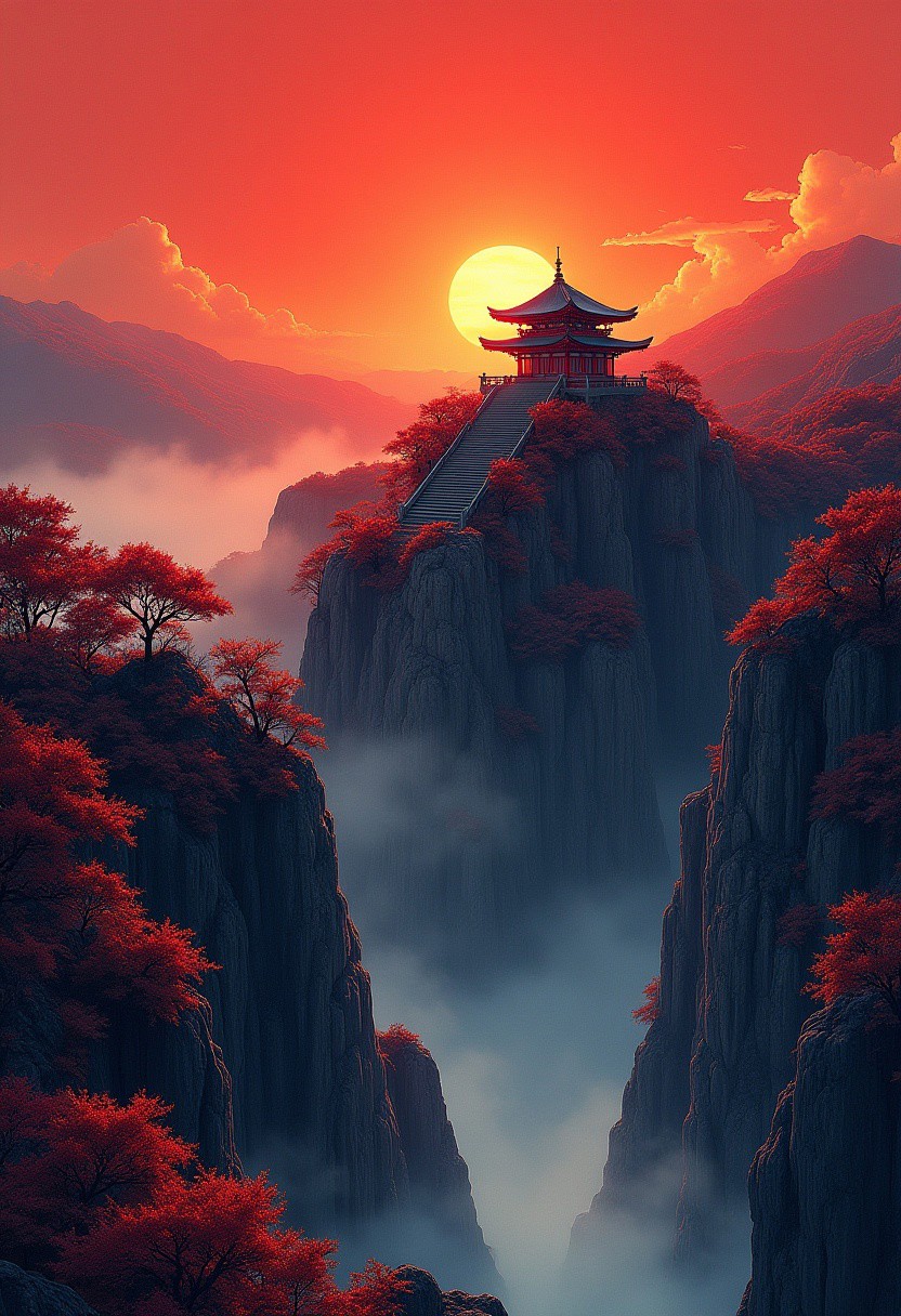 A dynamic inkpunk anime-inspired artwork showcasing a detailed ink sketch in vibrant red and deep black. Depict a serene Shinto shrine perched atop a majestic mountain, with a lengthy flight of stone steps leading up to it. Surround the shrine with a dramatic canyon and a deep ravine, enhanced by the enchanting hues of a sunset spilling across the horizon. Wispy mist envelops the scene, adding an air of mystique, while the sky transitions from warm oranges to cool purples. The image evokes a sense of wonder and spiritual tranquility.aaa