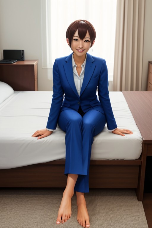 Score_8_up, score_9_up, Style_Anime, 1 girl, pokemon, lorelei, office suit, barefoot, soles, presenting soles, looking at viewer, smiling, sitting on bed, In Bedroom,