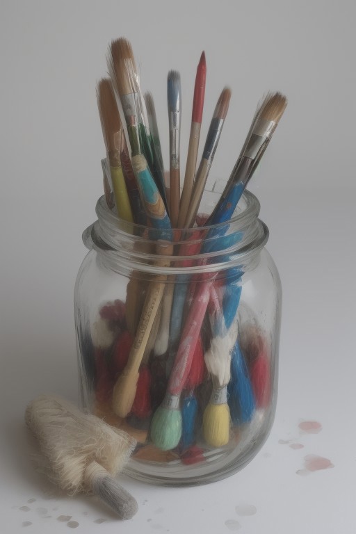 A collection of paintbrushes, each covered in vibrant paint splatters. They are housed in a glass jar, which is set against a blurred background of abstract colors, suggesting an artistic setting. The brushes vary in size and shape, with some bristles appearing longer and others shorter. The paint on the brushes is multicolored, with hues of blue, red, yellow, and green being prominently visible.