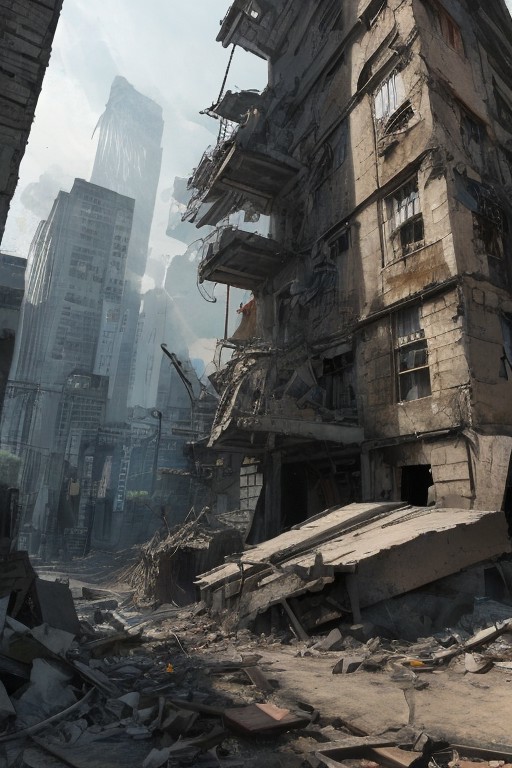 destroyed, rubble, The image features a curious cat woman peering out from the side of a building. The cat has a predominantly black coat with a distinct white patch on its chest, and its bright eyes are wide open, giving it an inquisitive appearance. It is positioned at an angle, with its head slightly turned as it looks out towards the viewer or the street below. In the background, there is a ruin of a multi-story building with numerous broken windows, showcasing a typical urban dystopian setting. The architecture appears somewhat utilitarian, with a mix of air conditioning units and various window styles. The wall against which the cat is perched is textured, likely made of bricks, and there are several metal protrusions or brackets extending from the wall, which may have been used for scaffolding or other construction purposes. The lighting in the image creates a contrast between the shadowed areas and the brighter parts, lending a dynamic quality to the scene. The cat's dark fur stands out against the lighter tones of the building, drawing the viewer's attention to its presence. The overall composition evokes a sense of curiosity and playfulness, typical of feline behavior, while also capturing the essence of urban life.