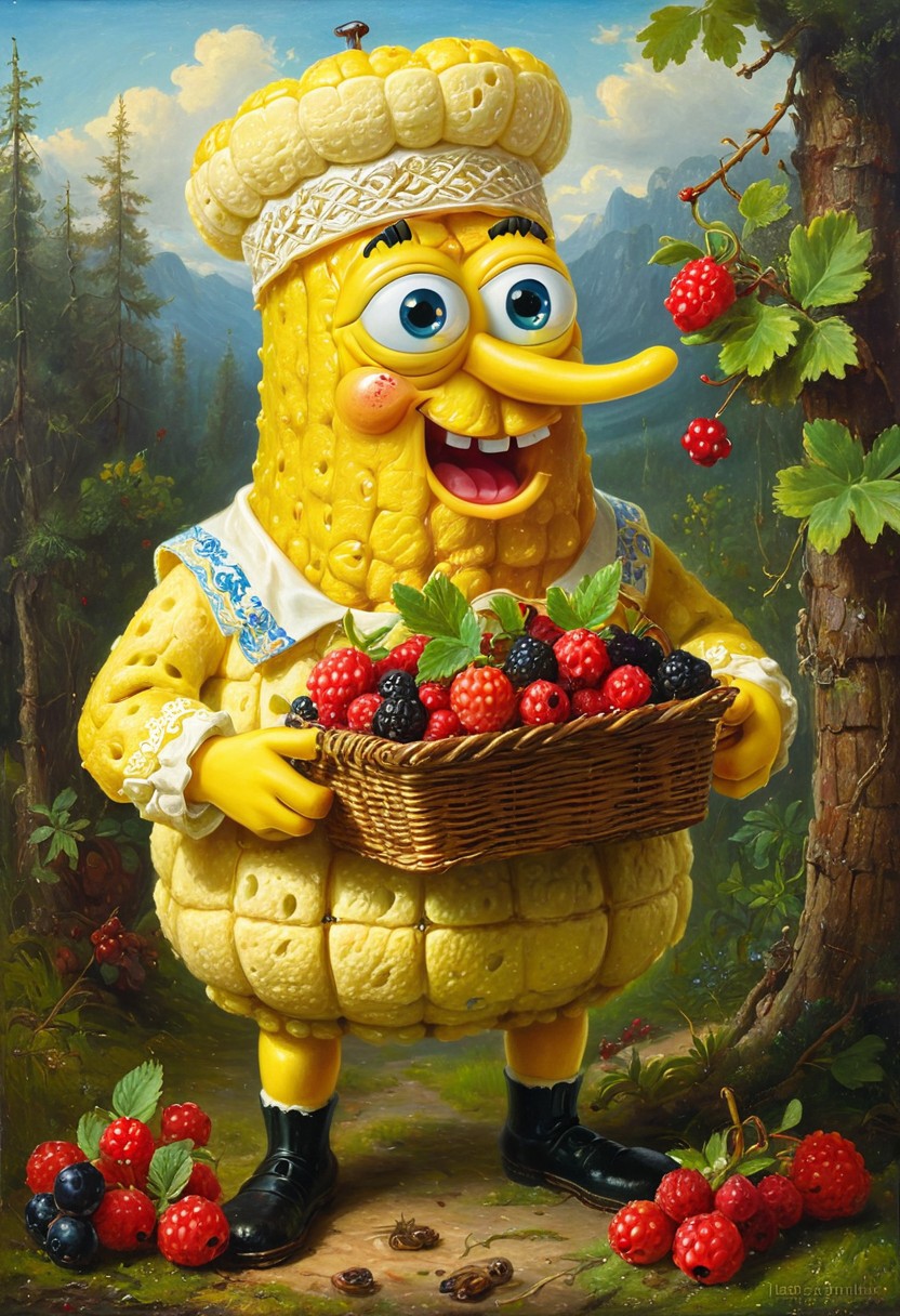 A Sponge Bob holds a basket of berries in its mouth, from side, traditional russian clothing, long-range plan, oil on canvas, by Ivan Shishkin, <lora:ClassipeintXL1.9:0.2>, ,best quality, high resolution, extreme detail, outstanding composition, masterpiece,