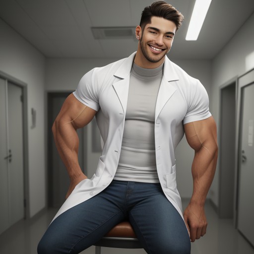 a beautiful 18yo male lean doctor is wearing a white unbuttoned lab coat and is shirtless and he has short brown hair, full body shot, cover model, and he is inside a hospital, he is smiling as he looks down at a very short hugely muscular 18yo bodybuilder man patient who is seated and is wearing a very tight white T-shirt with a plunging neckline showing most of his huge pecs and deep cleavage and blue jeans and he is beardless and clean shaven and has a huge bulge in his crotch and he has medium length black hair, messed up style hair, cover model, dark tan and glossy sweaty skin, skin details, with one arm raised out to the side as he flexes his huge bicep and he is staring up at the doctor and he has matching earrings and bright blue eyes, ultrarealistic, hyperdetailed photography, soft light, model look