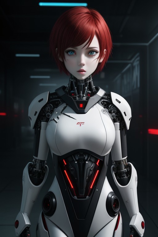 cybernetic robot 1woman, sexy, petite, ((white synthetic skin)), short hair, red hair, shaved side, undercut, <lora:IKAROS:0.4> IKAROS, android, battle damage, wearing tactical gear, big grey eyes, digital eyes, piersing nipple , ring piersing<lora:040790P:0.4> 040790P, score_9, score_8_up, score_7_up, score_6_up, score_5_up, score_4_up, . android, AI, machine, metal, wires, tech, futuristic, highly detailed