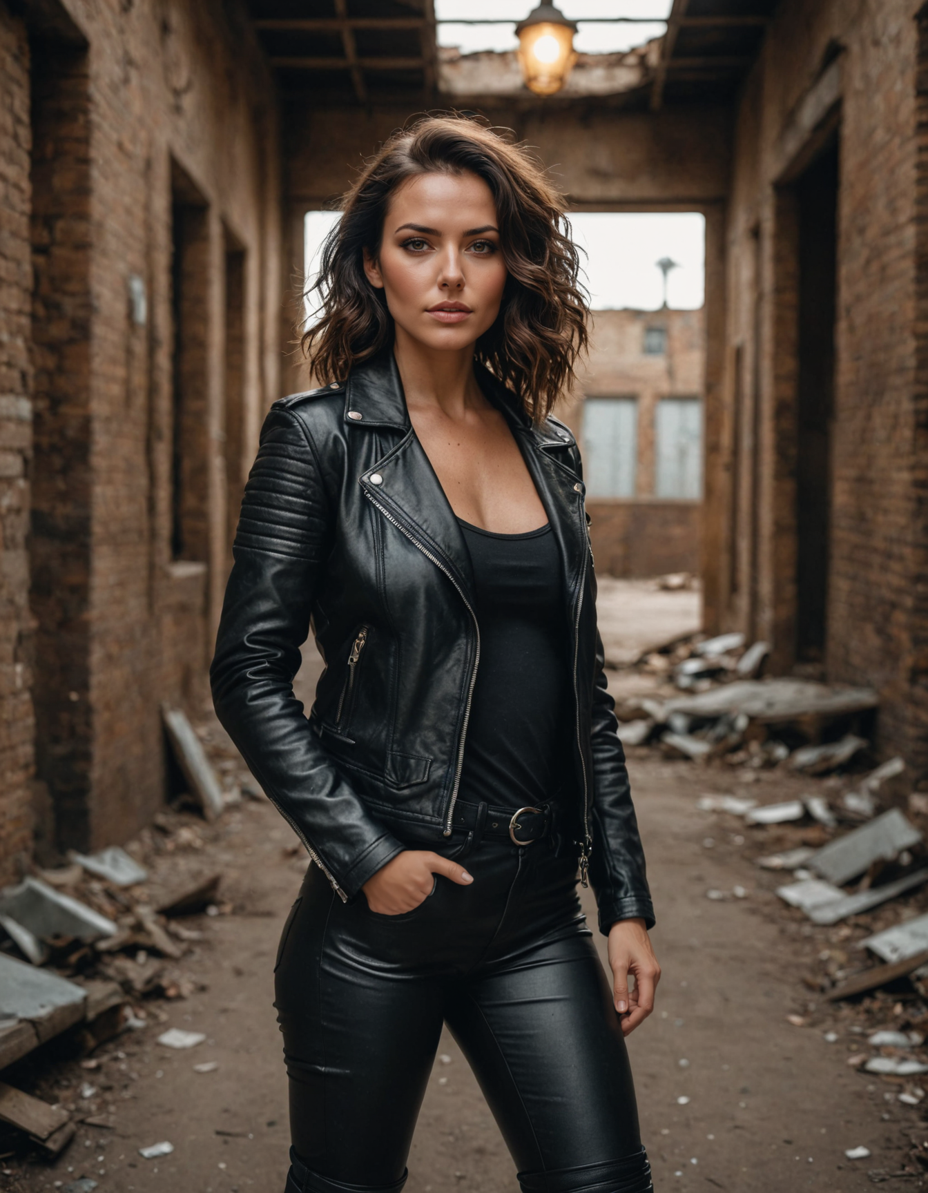 cinematic photo cinematic photo (Romantic:0.9),Australian woman, 37yo, Looking over the shoulder in an abandoned building, wearing edgy biker outfit with leather pants and heavy boots, naturally tanned skin with curly dark brown hair, Eye level view, Streetlamp glow,captured with Nikon Z7 II, (Pentax HD DA 15mm f/4 ED AL Limited:0.8),(SFW:0.7), (eyes slightly narrowed, focused:1.3) . 35mm photograph, film, bokeh, professional, 4k, highly detailed . 35mm photograph, film, bokeh, professional, 4k, highly detailed