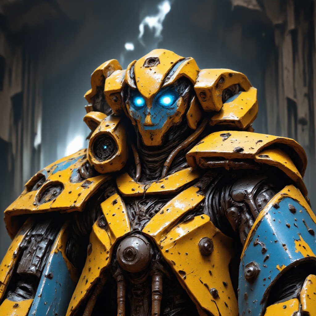 A futuristic battle-worn robot with a heavily armored exoskeleton, covered in chipped yellow and blue paint, revealing the metal beneath. The robot's face is angular and skull-like, with glowing blue eyes that emit an eerie light. Rust, dirt, and battle scars cover its body, giving it a rugged, post-apocalyptic appearance. Exposed wires and mechanical components intertwine throughout its form, adding to the industrial, cyberpunk aesthetic. The background is gritty and weathered, complementing the robotâs dystopian, sci-fi vibe.