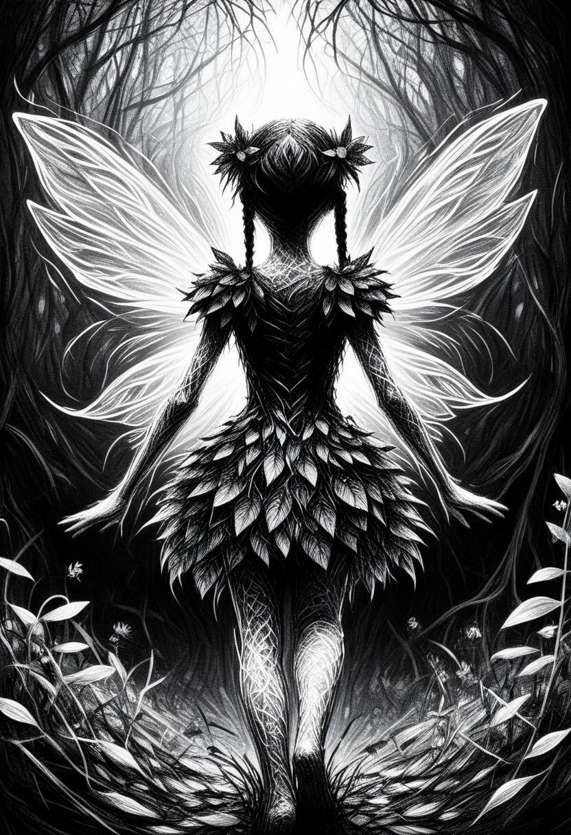 ScribbleRay , black and white sketch,Full Body Shot, girl, fairy, fairly dress made of leaves, cute, innocent, light smile:0.3, glittering translucent crystalized fairy wings, pale mystical warm skin and a slim body shape, barefoot, in a magical woodland made of vines and flowers and leaves, depth of field, dynamic angle,sharp, hyperdetailed.