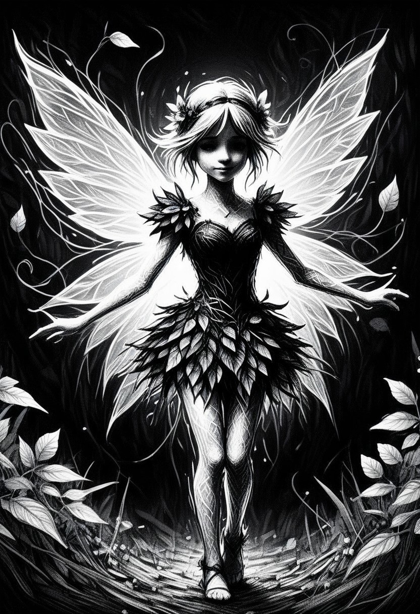 ScribbleRay , black and white sketch,Full Body Shot, girl, fairy, fairly dress made of leaves, cute, innocent, light smile:0.3, glittering translucent crystalized fairy wings, pale mystical warm skin and a slim body shape, barefoot, in a magical woodland made of vines and flowers and leaves, depth of field, dynamic angle,sharp, hyperdetailed.