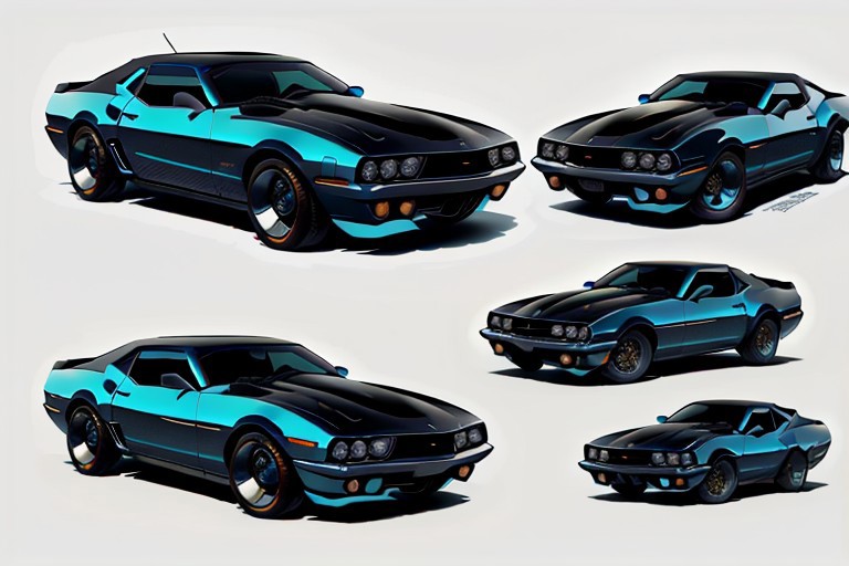futuristic, chevrolet camero, headlights, black and blue, reference sheet, gray canvas, color guide, all angles