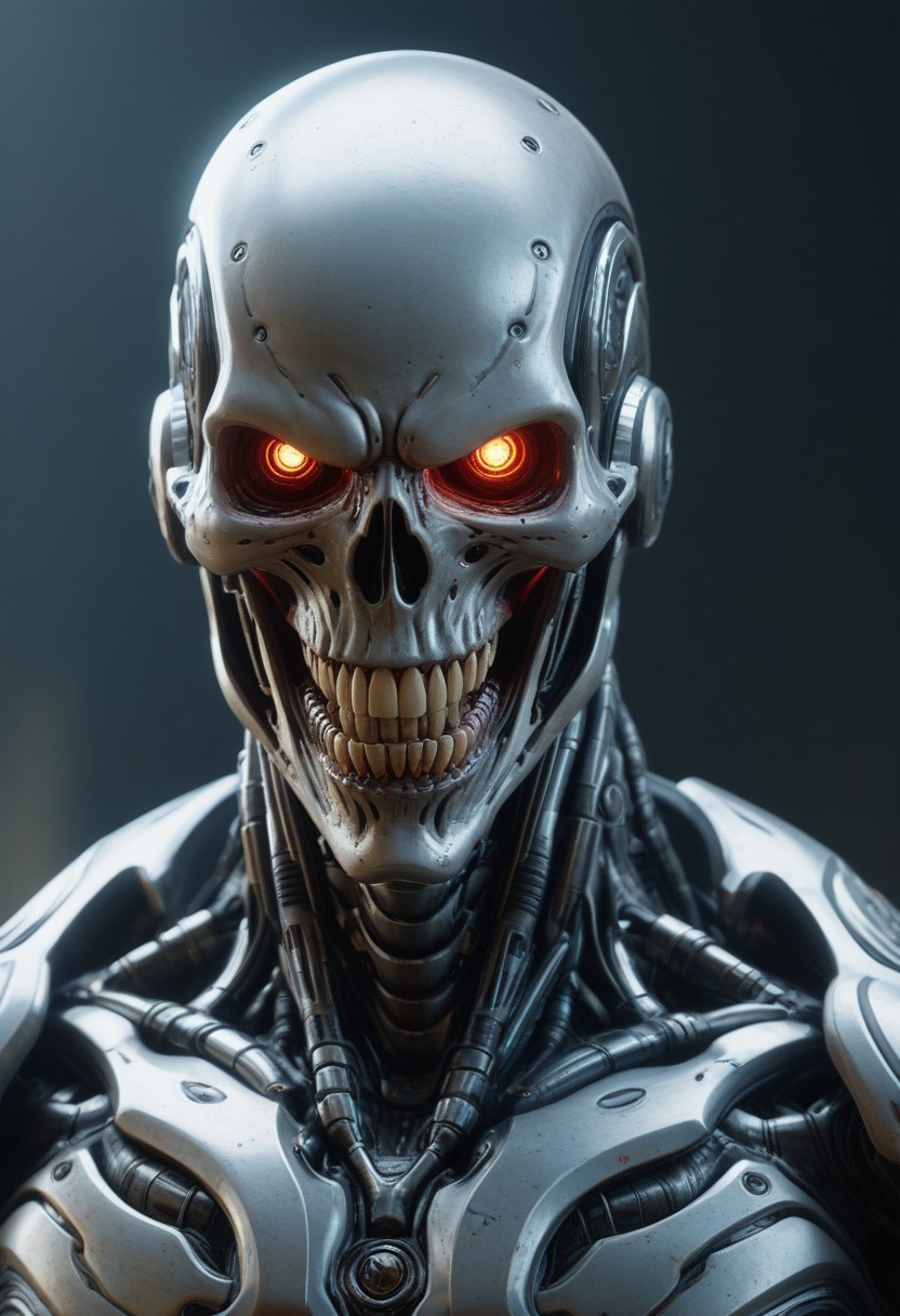 score_9, score_8_up, score_7_up, score_6_up,Cyborg killer.close up to face. big crazy grin and bulging eyes. A beautiful painting. perfect anatomy, perfect composition, beautifully detailed insanely detailed octane renderings, Artstation trends, 8k art photography, photorealistic concept art , natural volume Cinematic Perfect Light Software, Chiaroscuro, Award Winning Photography, Masterpiece, Oil on Canvas, Ultra HD, Realistic, Vivid Colors, High Detail, UHD Painting, Pen and ink, perfect composition,beautiful detailed complex insanely detailed octane rendering, artstation trends, 8k art photography, photorealistic concept art, soft natural volumetric cinematic perfect light - 9:16 - stylization. Dadaism. :: – (full height, wide angle, centered, no cropping) – ar 9:16 – ar 1:2 .SilverPulse. cybervision