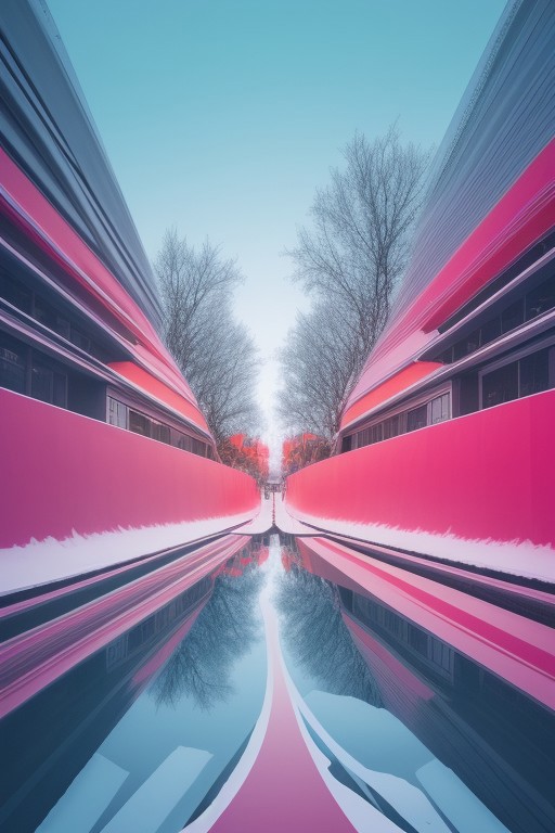 minimalism, abstract, orange, fuchsia, blue, perspective, double exposure, waterfront in winter, surreal, hyper-detailed, intricate details, professional photo, vivid colors, full-scene view