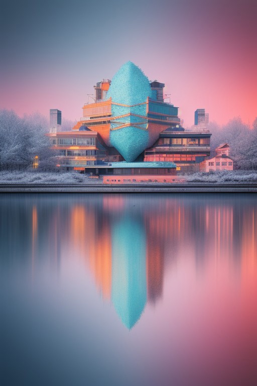 minimalism, abstract, orange, fuchsia, blue, perspective, double exposure, waterfront in winter, surreal, hyper-detailed, intricate details, professional photo, vivid colors, full-scene view