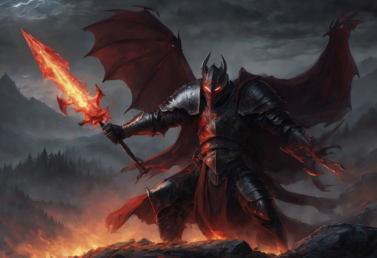 erserker, helmet, red eyes, glowing, black armor, clawed gauntlets, claws, torn cape, blood on clothes, cinematic angle, medieval, night, moonlight, hill, stones, starry sky, masterpiece, best quality, huge weapon, weapon over shoulder, angry, furious, fighting Dragon, Buring Forest,