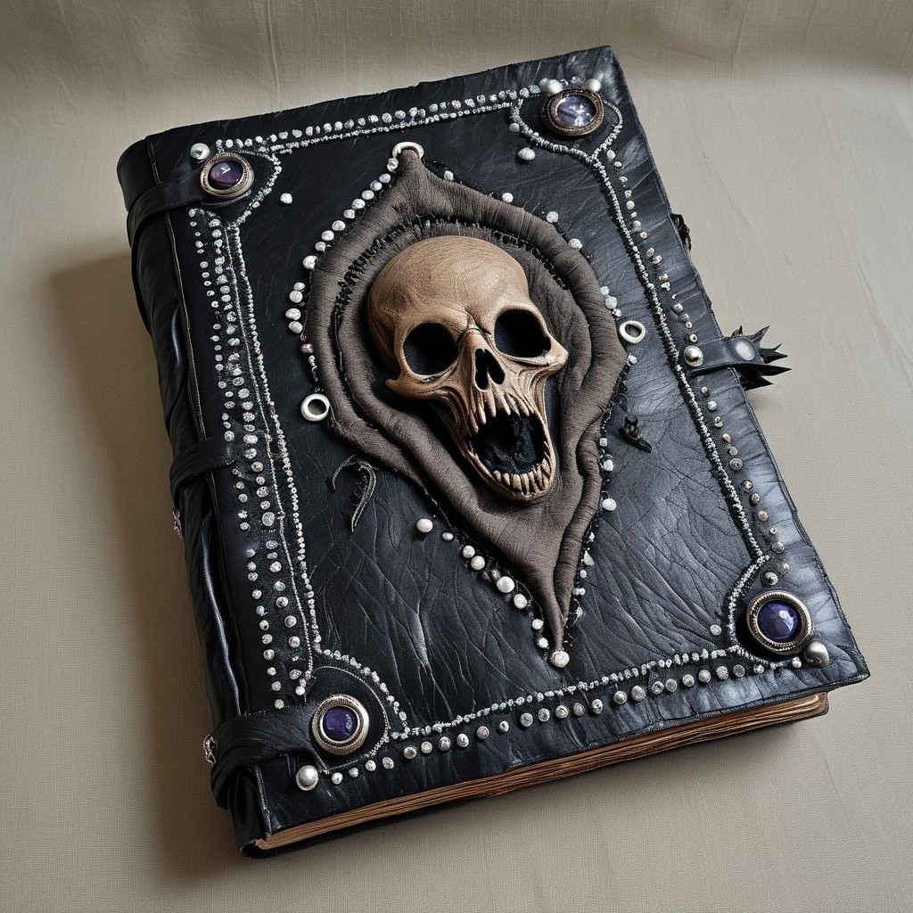 cs-l3ath3r, occult spell book necronomicon made from human skin, with eyes humans and mouth humans embedded in the cover, gloomy, black magic, macabre,