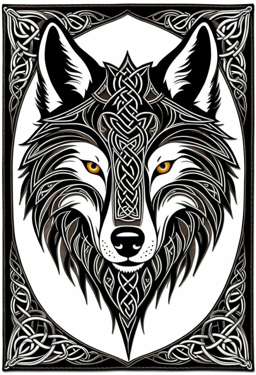cs-l3ath3r,Celtic knot wolf design, intricate knotwork pattern, detailed wolf head, menacing expression, (detailed teeth:1.2), (detailed fur:1.2), (strong jawline:1.1), ornate decorative elements, (knotwork:1.3), symmetrical composition, black and white line art, detailed ornamentation, high detail, tattoo design, decorative style, Viking style, medieval style, (bold lines:1.2), (precise lines:1.3), detailed background, dynamic pose, centralized, facing viewer, full frame, vector graphics, art nouveau, graphic design, tattoo design,