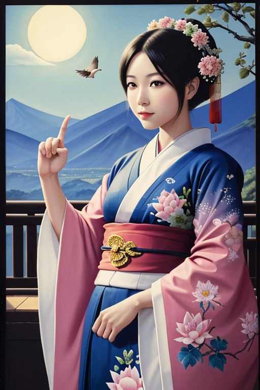 chinese card with a bored and expressionless (woman wearing fancy punk clothes holding up the middle finger1.2), hand raised, with chinese characters on it, 1girl, burlesque, art_nouveau, asa_no_ha_\(pattern\), bird, branch, egasumi, fine_art_parody, fish, fishnets, realistic, flower, japanese_clothes, kanji, kimono, leg_hair, lotus, mount_fuji, nihonga, old, old_man, paddle, painting_\(medium\), paper_lantern, photo_\(medium\), pink_flower, rising_sun, short_sleeves, solo, sun, traditional_media, watercolor_\(medium\), <hypernet:vintageChinese_chinprop:0.8>, detailed face, detailed hands, colorgraded, wine glass and stem, <lora:lomodiffusionLora300_lomodiffusionLora300:0.4>, <lora:Jordan_2:1>, <lora:cheeseDaddysLandscapes_35:0.45>, full resolution, 600dpi, 1200dpi , <lora:middleFingerLORA_midfingv1:1>