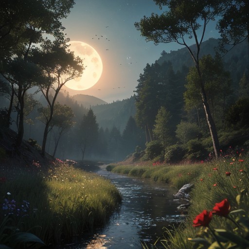 Sanctuary. Landscape. Stream, small river, its banks are full of red roses, lush vegetation, trees and wild flowers. Night, moonlight. Fairytale scene with a swarm of fireflies flying over the water, their light shimmering in the deep shadows. No human. Epic landscape, desolate atmosphere, volumetric lighting, photorealistic, masterpiece, 64k, UHD, ultra detailed, vivid colors, high quality, sharp focus