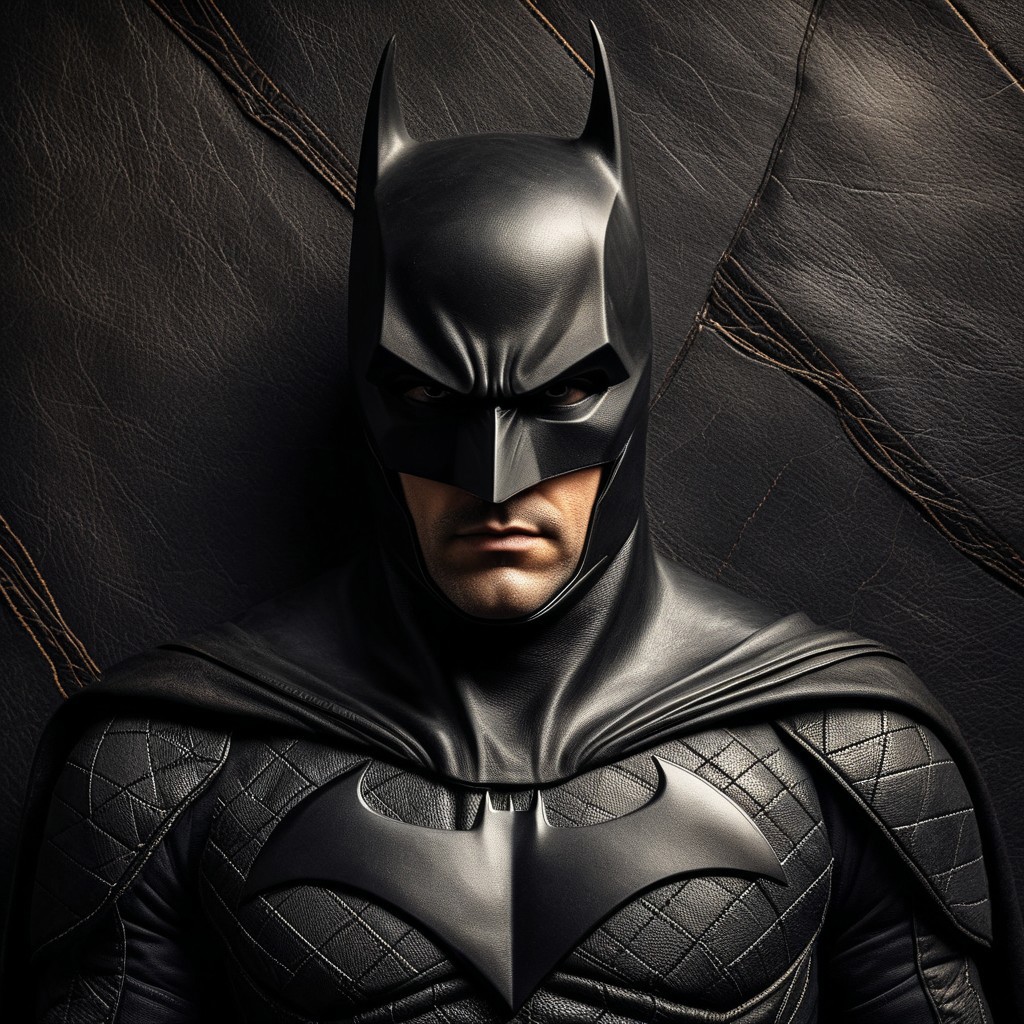 A striking mixed-media portrait of Batman, meticulously crafted from dark, textured leather panels and intricate stitching. The leather is aged and worn, with deep creases and natural imperfections adding character. The stitching follows the contours of his cowl and cape, creating a hand-sewn, artisanal effect. Subtle embossing and rivets enhance the details, giving a rugged, handcrafted appearance. Dramatic lighting with strong shadows emphasizes the depth and texture of the materials. The background is a dark, moody canvas with hints of Gotham’s skyline subtly embossed into the leather. The overall effect is a fusion of fine craftsmanship and gritty realism, resembling a high-end, custom-made leather artwork. cs-l3ath3r