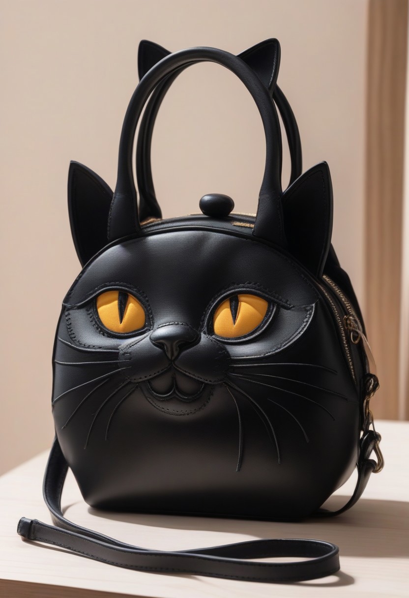 (decorative leather black cat handbag, ultra-soft detailed stitching:1.2), (ears as elegant handles, shocked expression, small hidden pocket in belly:1.1), (whimsical and cute, warm lighting, luxurious leather craftsmanship, playful fantasy design), cs-l3ath3r