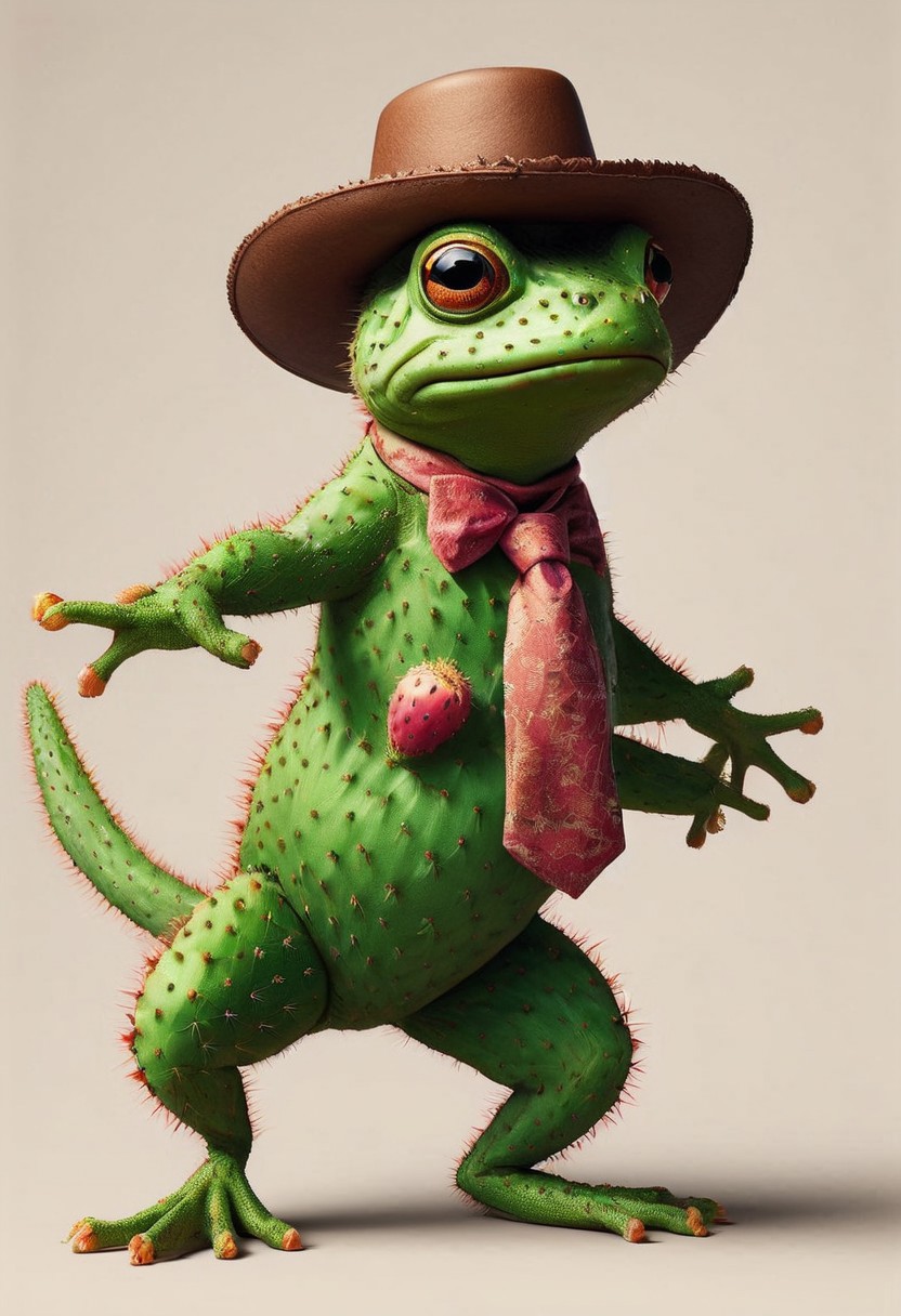 rating_safe, cjdl, score_9, score_8_up, score_7_up, style, high quality, best quality, best artist, A dancing frog in a cowboy in a hat, with a lasso, His hat made of Prickly Pear Style Cactus