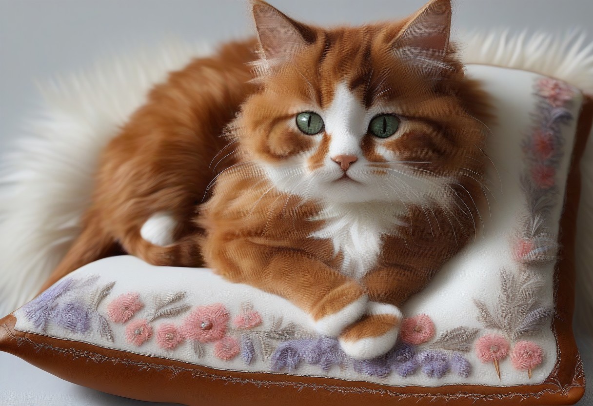 cs-l3ath3r, embroidery at leather cushion with fringes; (small fluffy kitty sleeping on cushion)