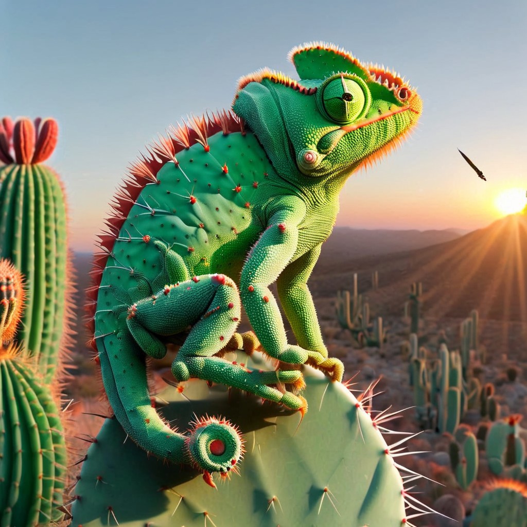 Cactus chameleon - changes color depending on the type of cactus, and its tongue is a long agave, tongue catches flies from cactus. sits on a branch of cactus. HD