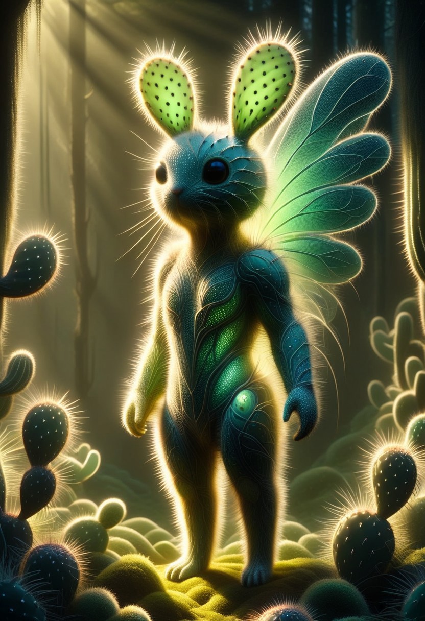 In an enchanted forest illuminated by soft twilight, a creature named Cabbelle is depicted. Cabbelle has a small, fluffy rabbit body and iridescent Prickly Cactus dragonfly wings. The Prickly Cactus wings display shades of emerald green and pearlescent white, resembling the layered structure of a Prickly Cactus. Her eyes emit a golden glow, and she holds a tiny lantern shaped like a Prickly Cactus blossom in her paws. The surrounding forest features bioluminescent flora, including trees with stardust-like leaves and floating, luminescent Prickly Cactus-shaped mushrooms. The ground is covered in soft, glowing moss. Cabbelle's wings are patterned with intricate Prickly Cactus leaf veins, which refract light into a spectrum of colors. The scene is devoid of emotional descriptors, focusing solely on the visual and structural elements of the environment and the creature, Prickly World with Cactus Creativity