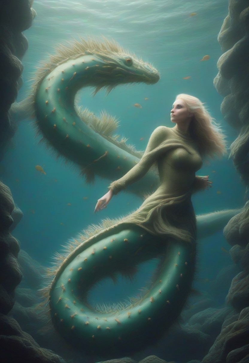 sfw, cartoon: (masterpiece), best quality, expressive eyes, perfect face,in a oceanarium , by the aquarium glass, side view;0.7, a cute ((18 yo girl, adult girl)) blonde siren girl in glasses , turtleneck long dress made out of prickly pear style , fishtail, playing indian, sea serpent dancing , small fisesh in the background, view from bellow, ff-aquaflux, snake charmer,