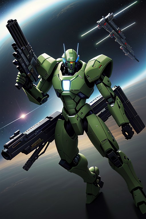 light green mecha armor, (flying toward the viewer:1.20), armaments equipped in the armor, (right hand holding beam rifle:1.20), space in the background:0.8, (beam rifle equipment on right hand:1.3), (shield equipment on left hand:1.3), mounted missile pod on shoulder
