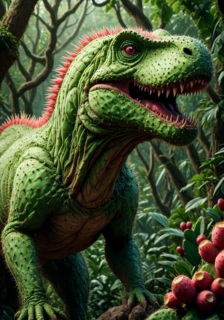 realistic, masterpiece, 4k, 8k, extremely detailed, sharp outlines, high contrast, fine details, intricate, A t-rex, Prickly pear texture, Red and green color theme, full body, jungle, amazing quality, very aesthetic, dynamic angle, face focus, depth of field, , , Prickly Pear Style v1<lora:- SDXL - vanta-black_contrast_V3.0.safetensors:0.2:0.2> <lora:sdxl1.0\Prickly Pear Style v1.safetensors:1.0:1.0>