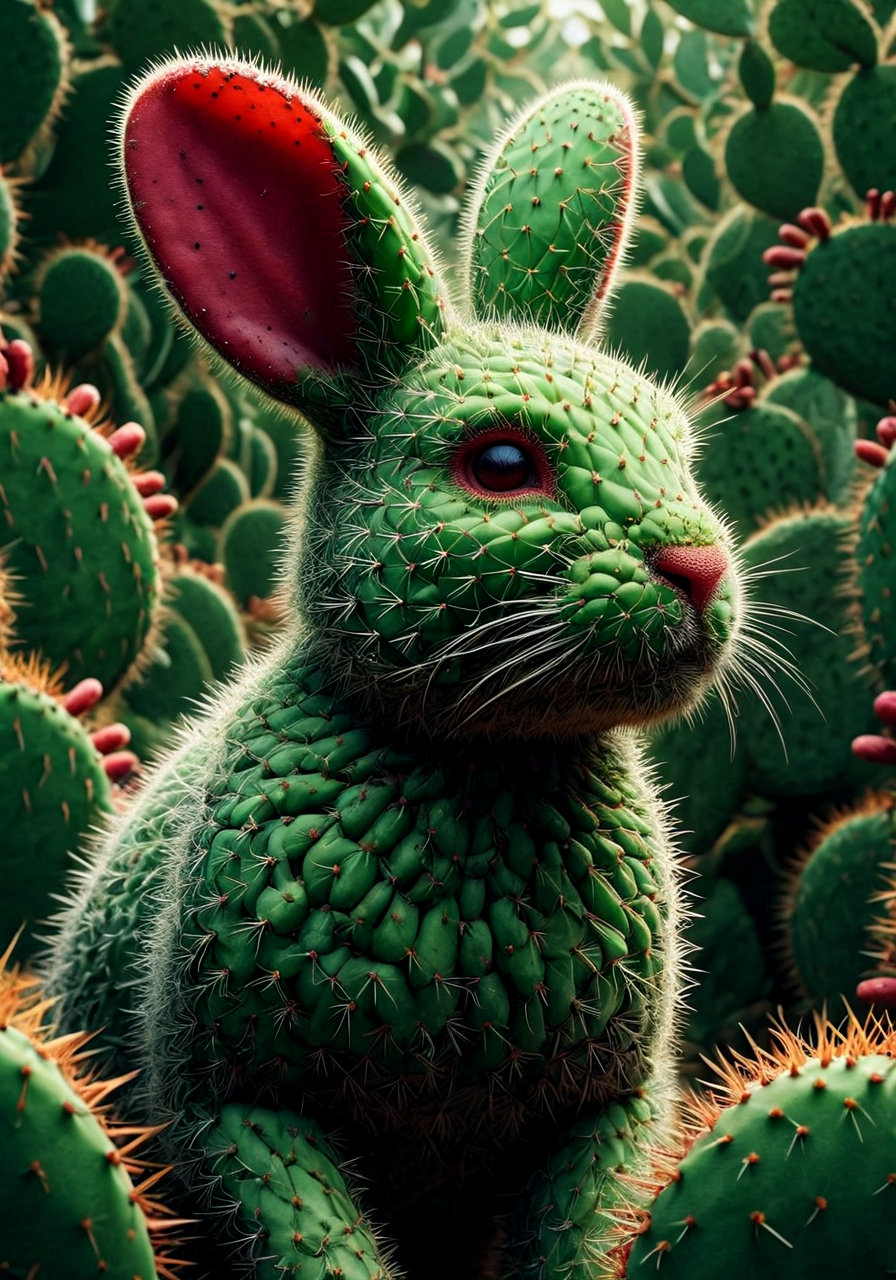 realistic, masterpiece, 4k, 8k, extremely detailed, sharp outlines, high contrast, fine details, intricate, rabbitr, Prickly pear texture, Red and green color theme, full body, plants, flowers, amazing quality, very aesthetic, dynamic angle, face focus, depth of field, rated safe , SFW, , , Prickly Pear Style v1<lora:- SDXL - vanta-black_contrast_V3.0.safetensors:0.2:0.2> <lora:sdxl1.0\Prickly Pear Style v1.safetensors:1.0:1.0>