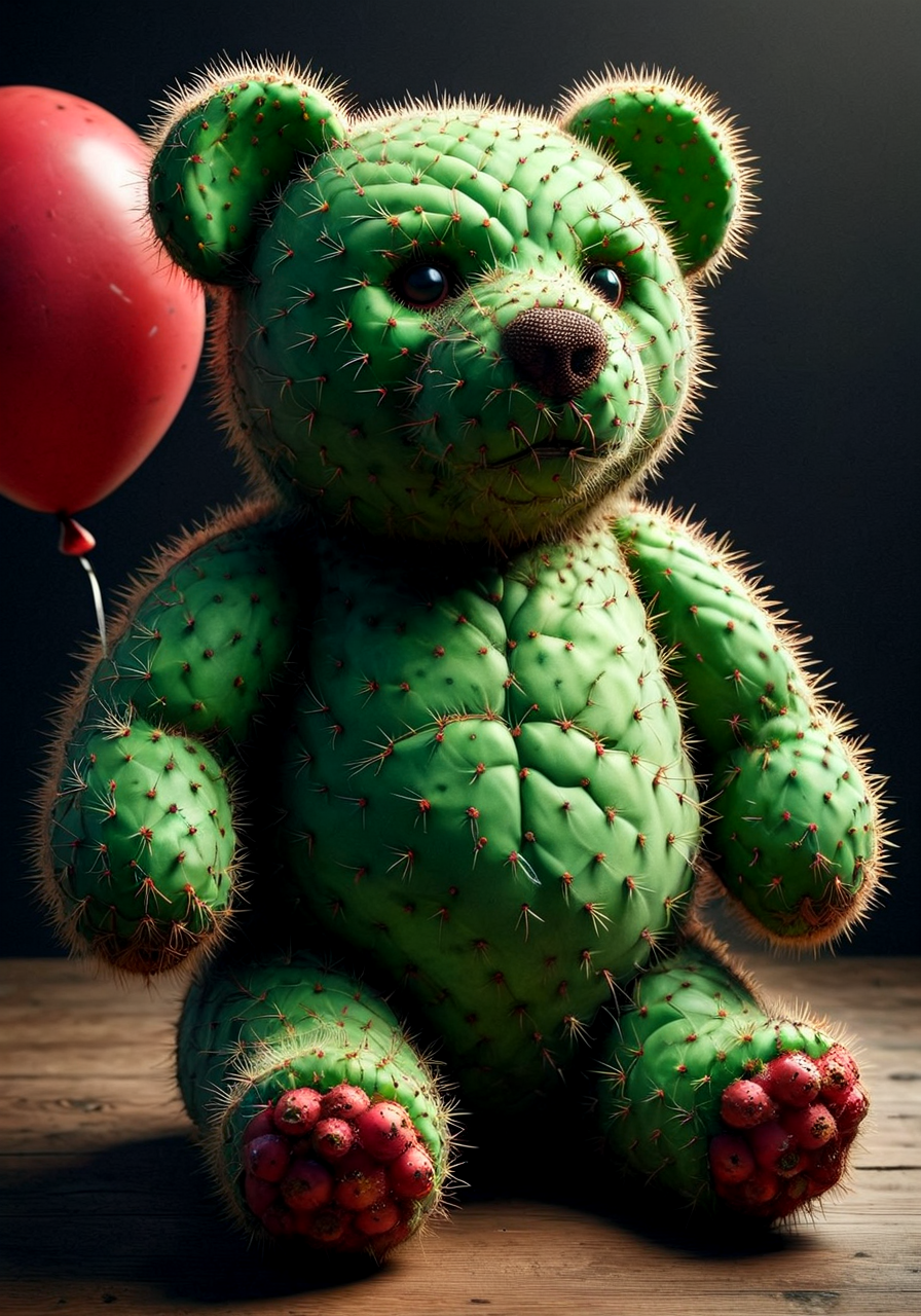 realistic, masterpiece, 4k, 8k, extremely detailed, sharp outlines, high contrast, fine details, intricate, A large teddy bear, Prickly pear texture, Red and green color theme, full body, ballons shop, amazing quality, very aesthetic, dynamic angle, face focus, depth of field, , , Prickly Pear Style v1<lora:- SDXL - vanta-black_contrast_V3.0.safetensors:0.2:0.2> <lora:sdxl1.0\Prickly Pear Style v1.safetensors:1.0:1.0>
