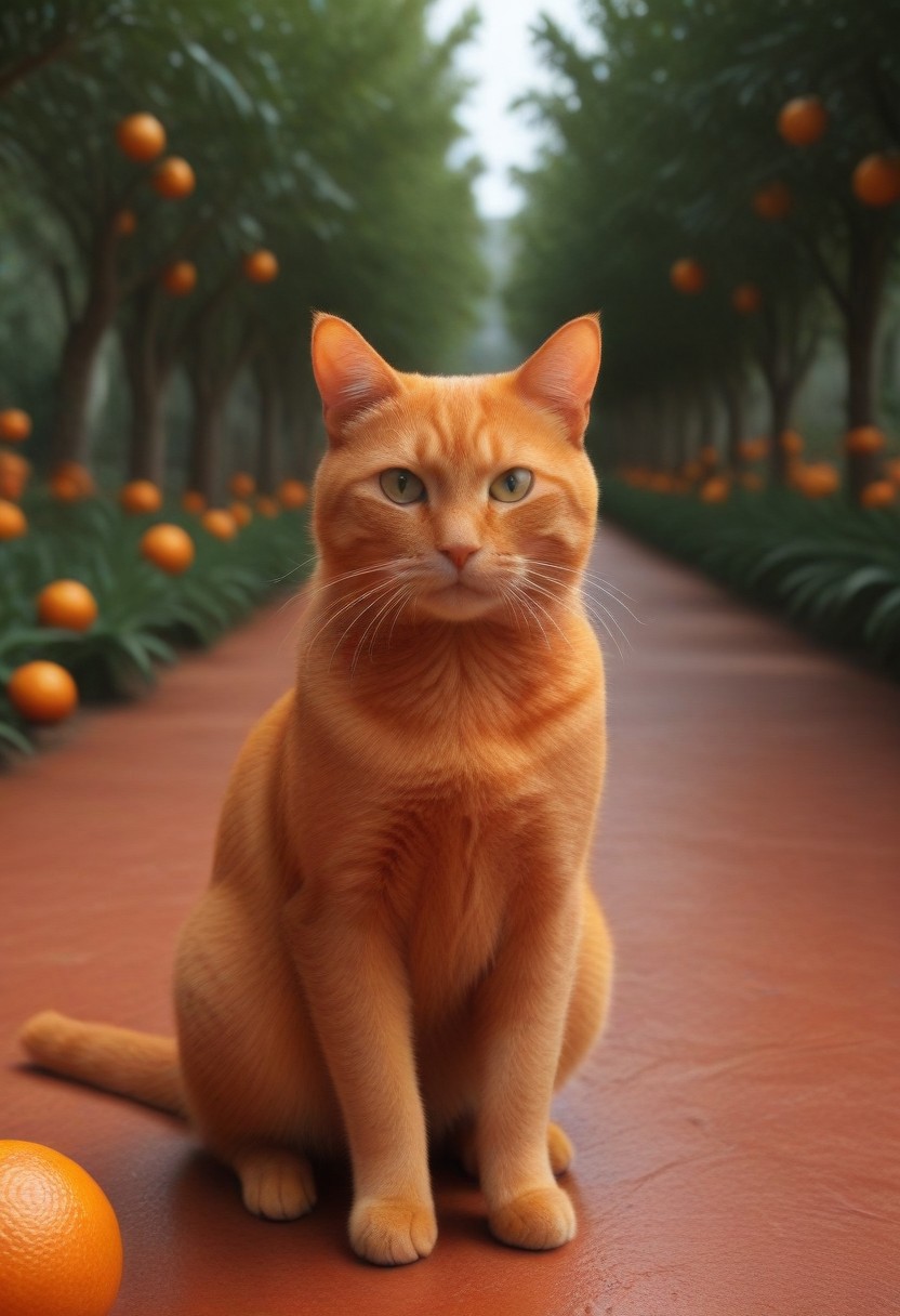 best quality, masterpiece, high resolution, intricate detailed, blood orange style, (cat:1.3), orange trees, tropical, humid, wavy, majestic, detailed digital art, close up, ground shot,