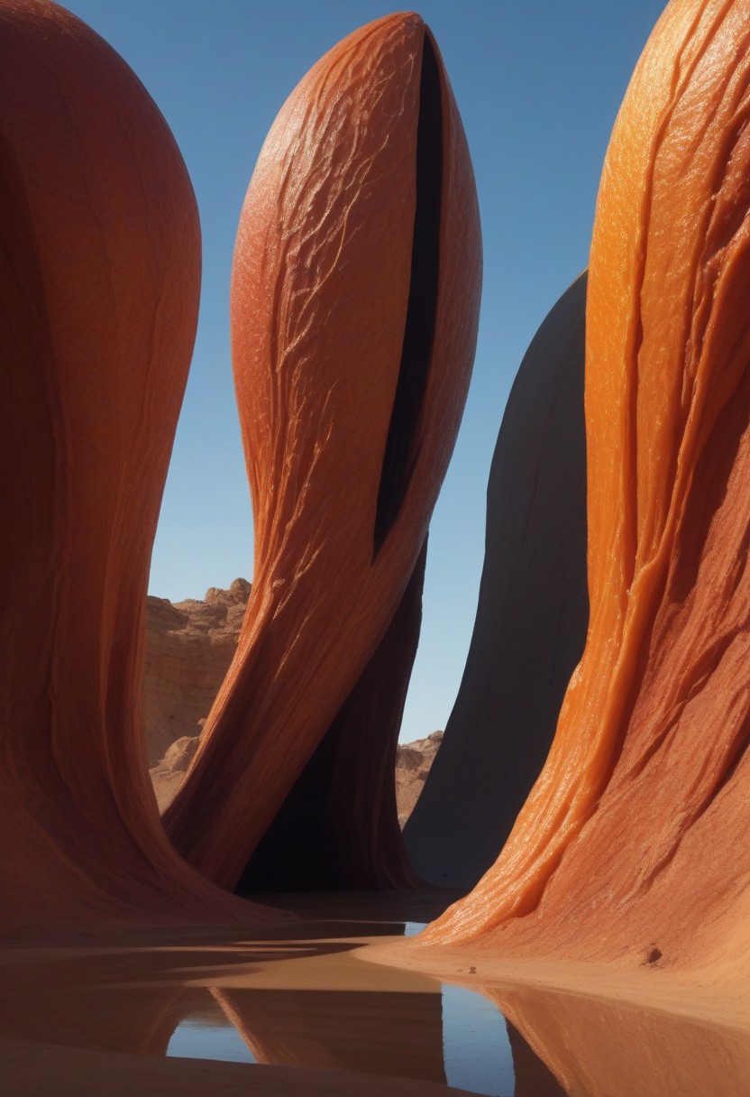 Transform the World with blood orange Creativity!, A surreal Venusian landscape with two colossal halved monoliths facing each other, forming a near-perfect circular portal in their combined silhouette. The monoliths rise from the cracked and rugged terrain, their weathered surfaces marked with faint erosion and illuminated by soft, turquoise-tinged lights that pulse gently at their edges. Suspended in the center of the portal, a mesmerizing vortex swirls with subtle turquoise and pale golden hues, shimmering like liquid energy, its motion slow and hypnotic, casting faint ripples of light onto the nearby surfaces. The surrounding atmosphere is a hazy mix of deep yellow and soft teal, giving the air a mysterious glow while allowing the landscape to retain its alien warmth. The ground is scattered with shallow reflective puddles that capture fragments of the swirling light, and faint cables snake across the rocky surface toward the portal, hinting at human intervention. Two explorers in worn terraforming suits, orange and dusted with grime, stand in awe before the monoliths, their silhouettes dwarfed by the grandeur of the scene as the swirling portal dominates their view.
