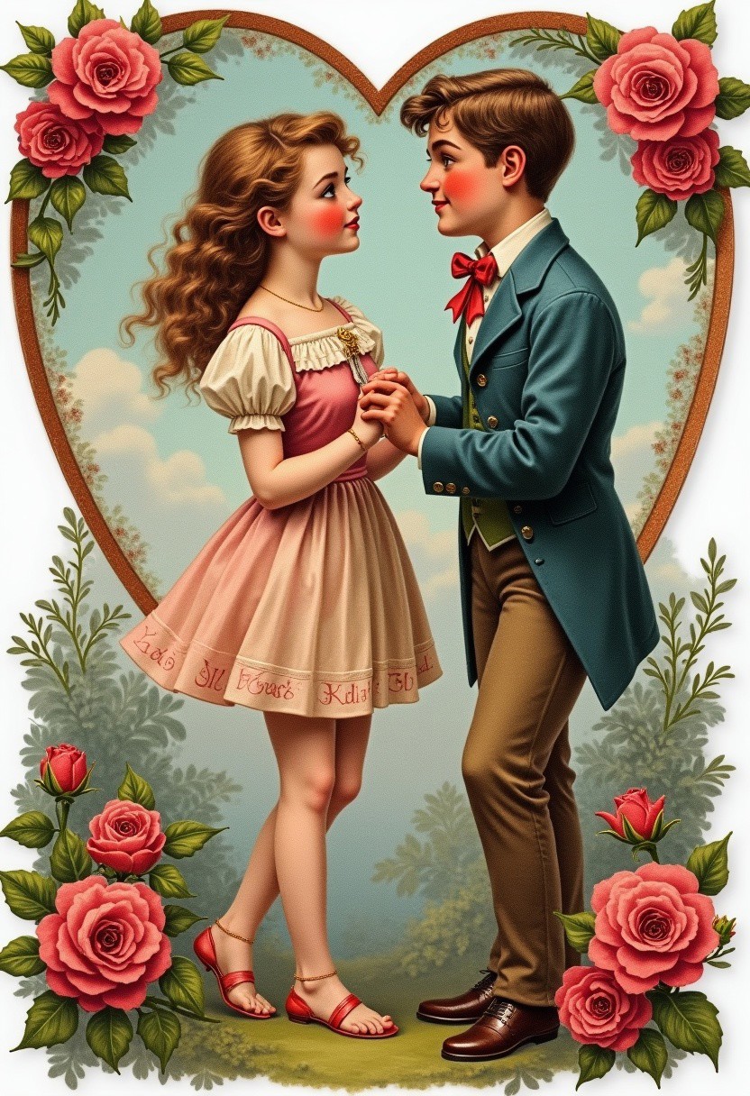 Victorian valentine’s card showing a young woman and her beau holding hands and looking lovingly at each their. They are surrounded by roses and other flowers.