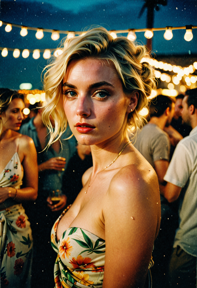 Polaroid film snapshot, a sexy young 30yo with a stylish blonde updo, at a rowdy rooftop party, her flimsy sarong blown by a wind gust, large gorgeous breasts , pretty face with expressive eyes wide in a dreamy yet mortified stare, soft feminine curves glowing under string lights, crowd buzzing in the dusk, photorealistic style, merging shy innocence with raw exposure