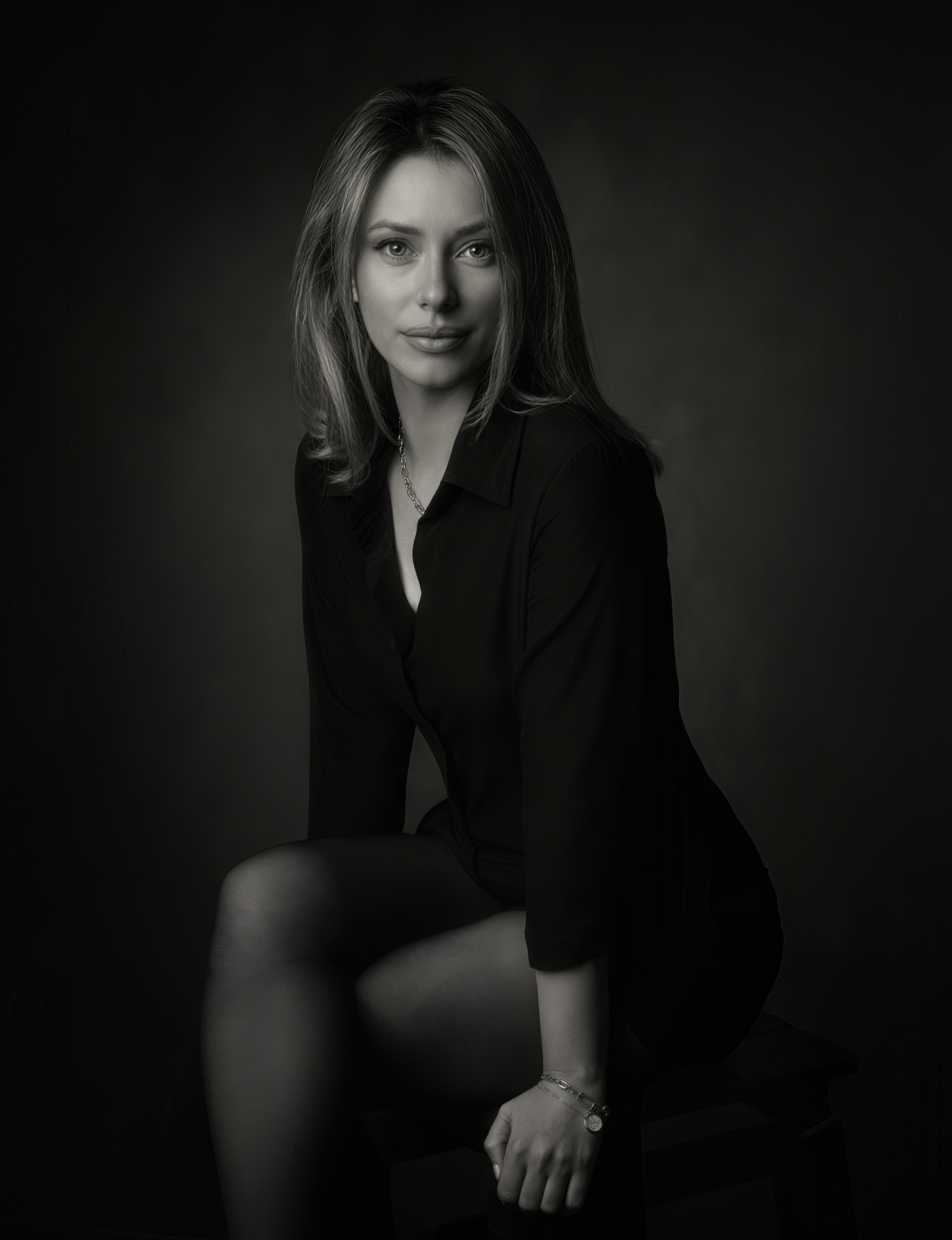 studio black and white photo woman sitting on chair in black short dress and stockings wristwatch, chain on neck, dim background lighting