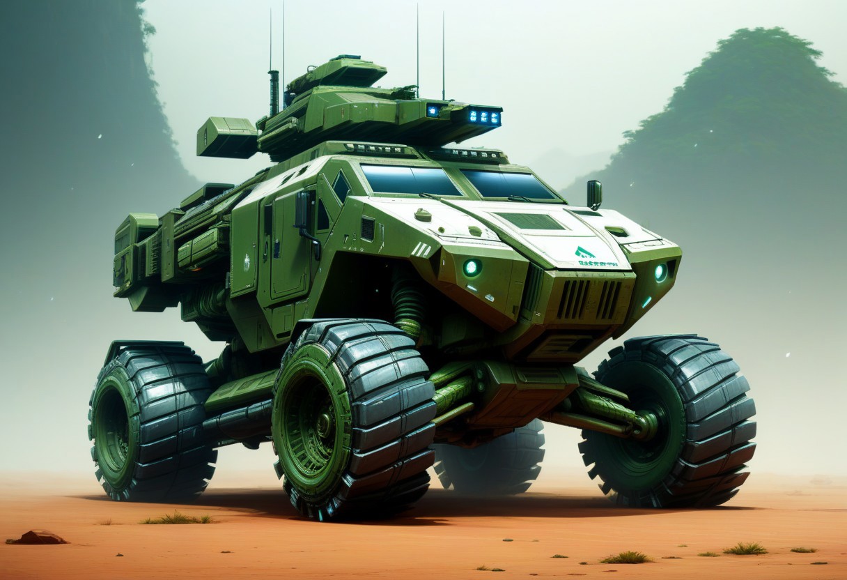 off-road vehicle heavily armored large, water india cyberpunk , military green ,white, big white number ,plant jungle mechanic, crew, sci.fi, realistic, tank tracks, protection tower