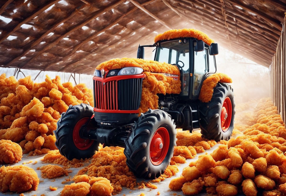 dfc, a tractor made of deep fried & crispy breading, day, chicken farm, fantastic atmosphere