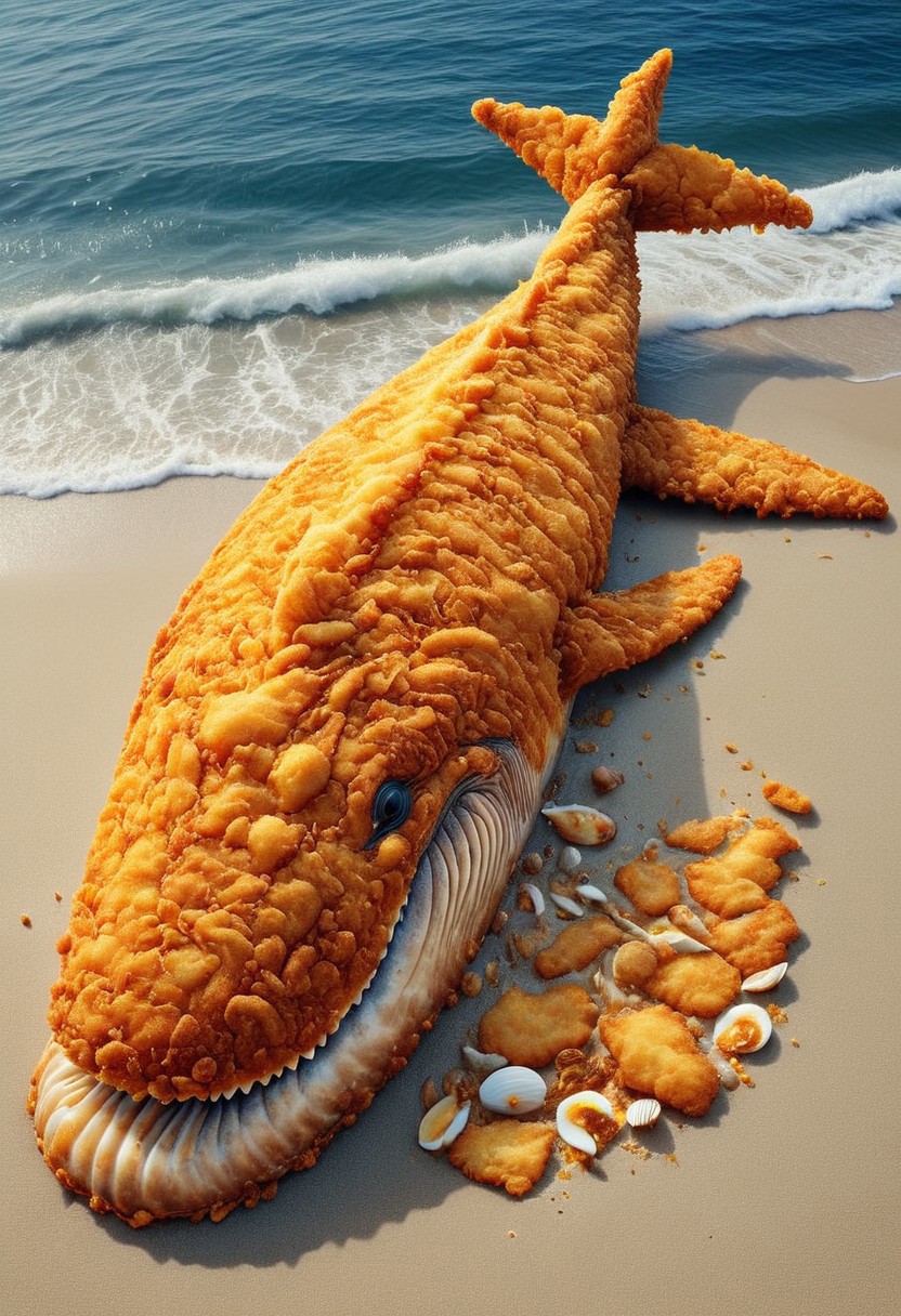 best quality, masterpiece, high resolution, intricate detailed, film grain, beautiful photo, DFC, a (whale on a beach:1.2) made of deep fried & crispy breading, natural light