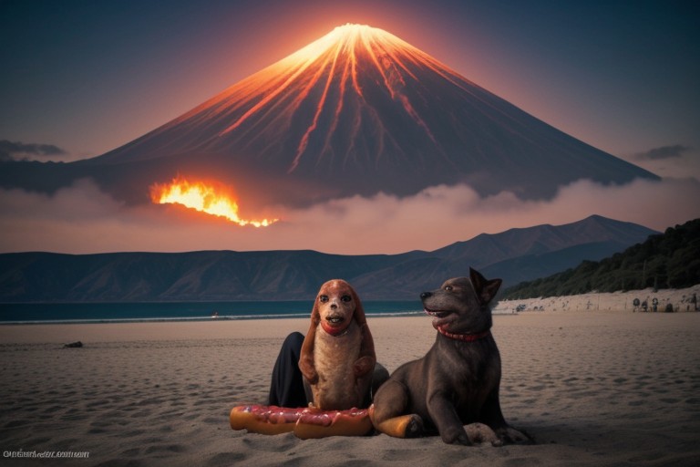 (((hotdog))), hotdogs, fire, (big text))), (((area 51))), ufo, mountain, volcano, apocalypse, fire, (beach background), tbyrtdybdrbdbrddtnrtdy